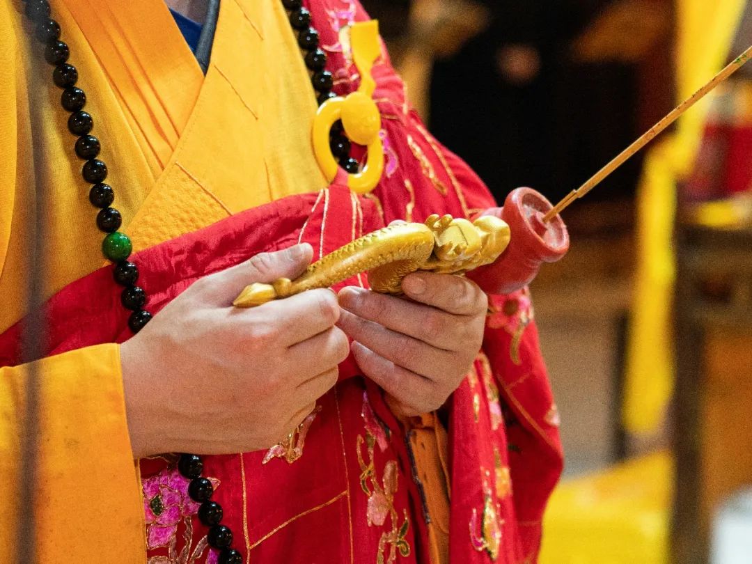 内坛完成发符仪式后,法师与斋主一起到镇坛大将军前奉香礼敬,唱诵经文,祈请镇坛大将维护法会秩序,使法会能够顺利进行。