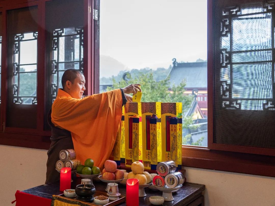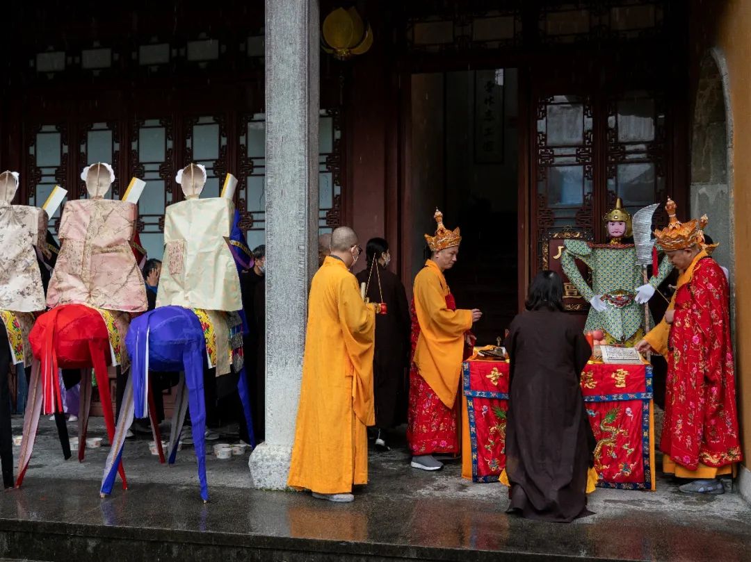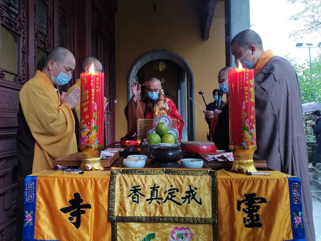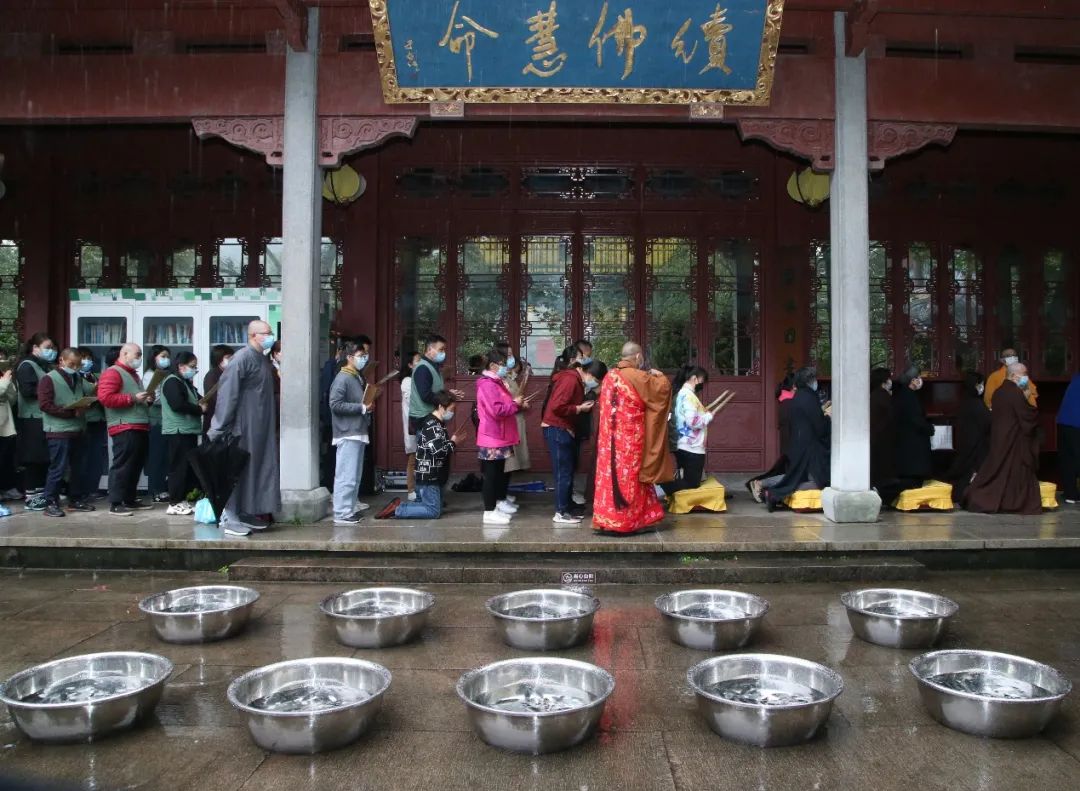 下午14时,灵隐寺内甘霖普降,水陆法会放生仪式在药师殿西侧平台举行。