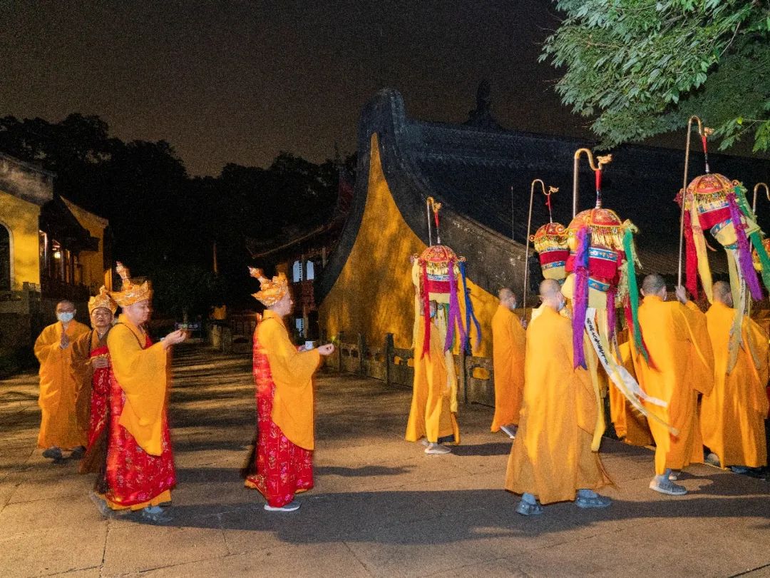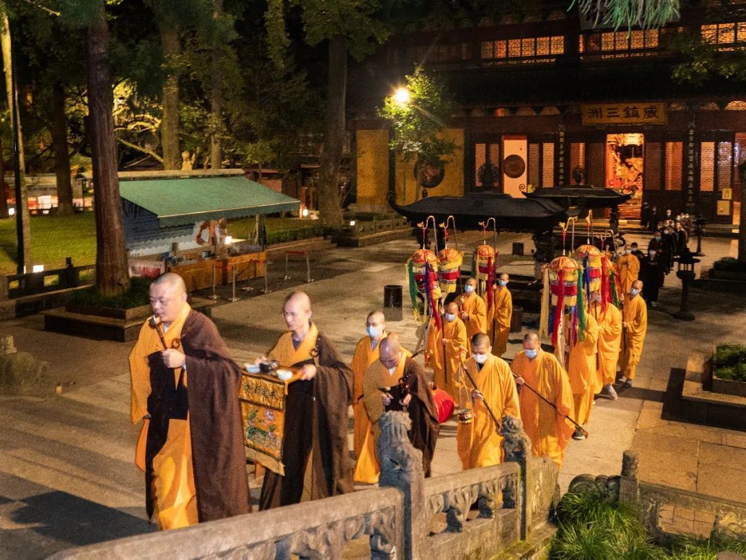 杭州灵隐寺于2021年10月18日—24日(农历九月十三至九月十九)启建辛丑法界圣凡水陆普度大斋胜会,阖寺法师虔诚恭敬地举行诵经、礼忏、持名、请圣、斋天、放生、施放瑜伽焰口、普佛、说幽冥戒、送圣等法事活动,祈愿诸佛菩萨、护法龙天慈悲加持,超度古往今来水陆空一切有情众生,