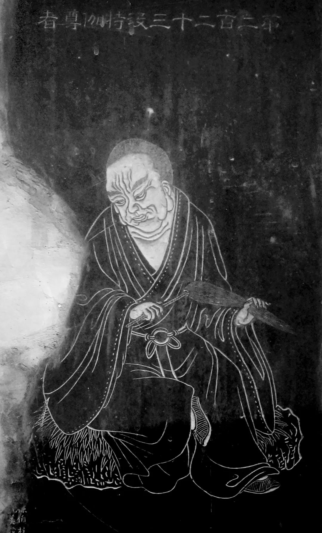 尊者法相所现为右手执佛子,左手捋佛须,飞眉神目,满面愁苦。