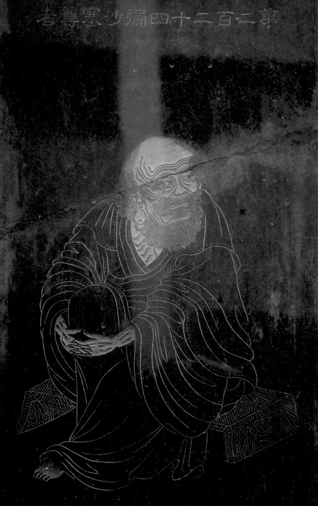 五百罗汉第贰佰贰拾肆尊弥沙塞尊者,又作弥沙翼,弥喜舍娑柯,意译化一、化地、不着有无观。相传,弥沙塞是优婆毱多的五个弟子之一,精通佛理,智慧超凡。