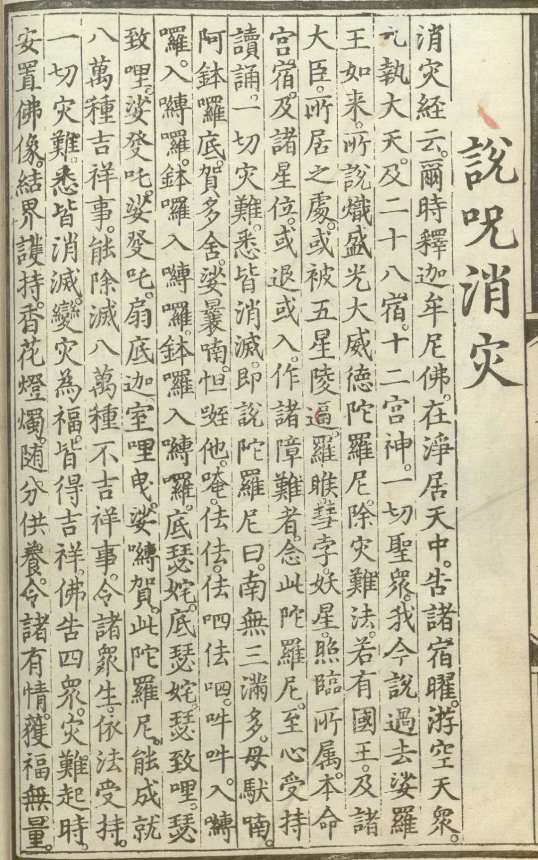 消灾经云。尔时释迦牟尼佛在净居天中。告诸宿曜。游空天众。九执大天。及二十八宿。十二宫神。一切圣众。我今说过去娑罗王如来所说。炽盛光大威德陀罗尼。除灾难法。若有国王。及诸大臣。所居之处。或被五星陵逼。罗睺彗孛。妖星照临。所属本命宫宿。及诸星位。或退或入。作诸障难者。念此陀罗尼。一至心受持读诵。一切灾难皆悉消灭。