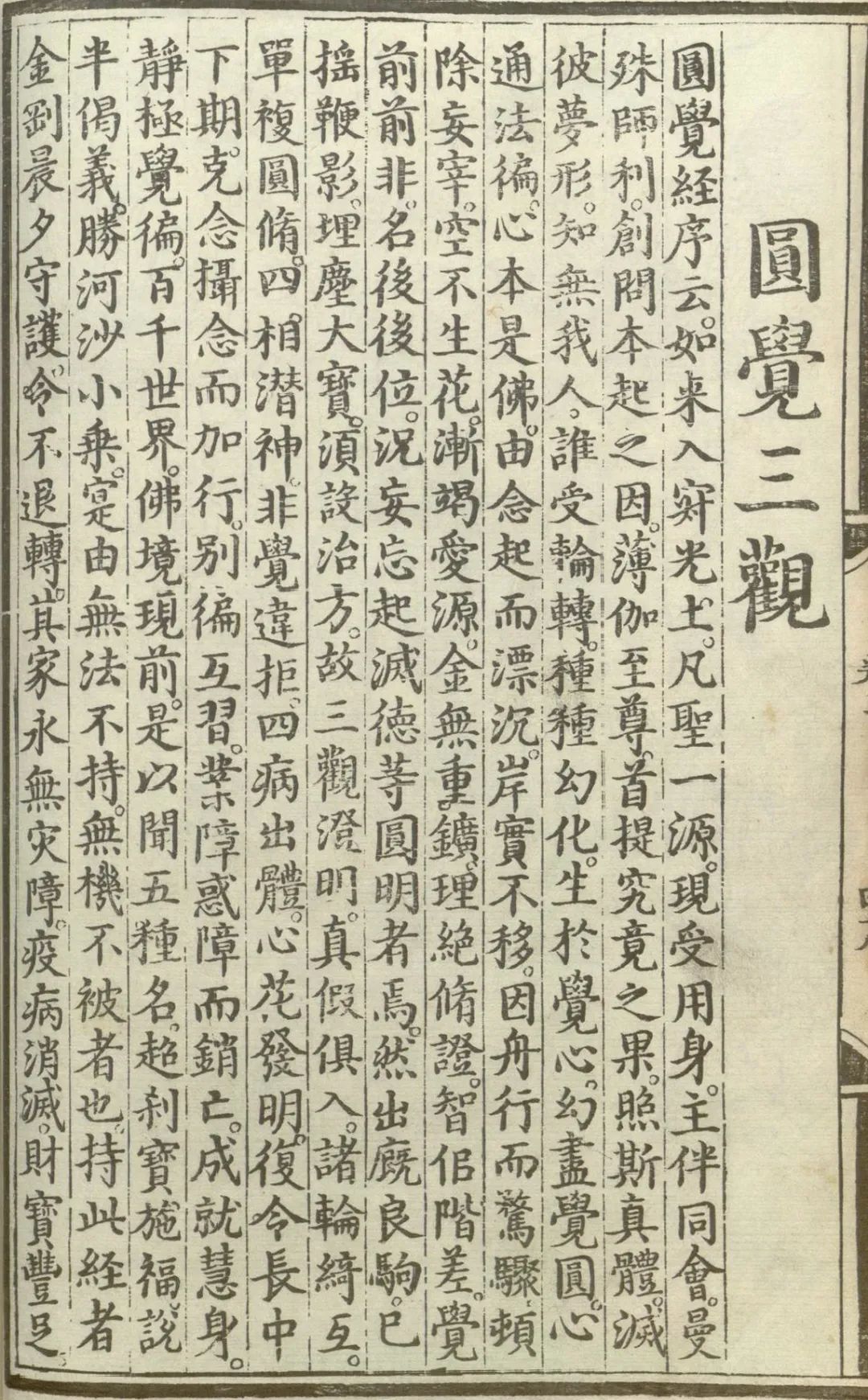 圆觉经序云。如来入寂光土。凡圣一源。现受用身。主伴同会。曼殊师利创问本起之因。薄伽至尊首提究竟之果。照斯真体。灭彼梦形。知无我人。谁受轮转。种种幻化。生于觉心。幻尽觉圆。心通法遍。心本是佛。由念起而漂沉。岸实不移。因舟行而骛骤。顿除妄宰。空不生华。渐竭爱源。金无重矿。理绝修证。智似阶差。觉前前非。名后后位。况妄忘起灭。德等圆明者焉。然出廐良驹。已摇鞭影。埋尘大宝。须设治方。故三观澄明。真假俱入。诸轮绮互。单复圆修。四相潜神。华觉违拒。四病出体。心华发明。复令长中下期。克念摄念而加行。别遍互习。业障惑障而销亡。成就慧身。静极觉偏。百千世界佛境现前。是以闻五种名。超刹宝施福。说半偈义。胜河沙小乘。实由无法不持无机不被者也。