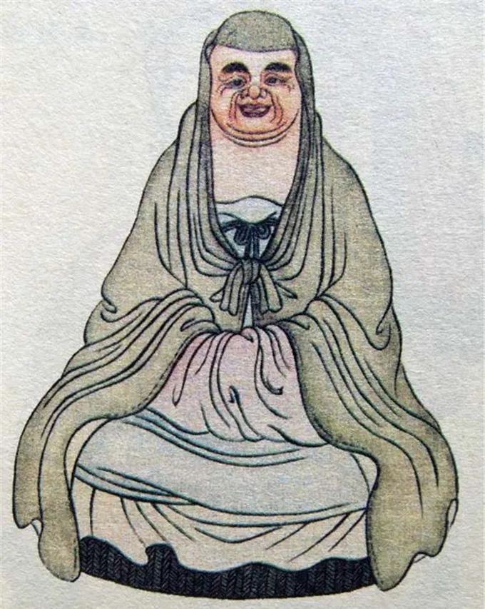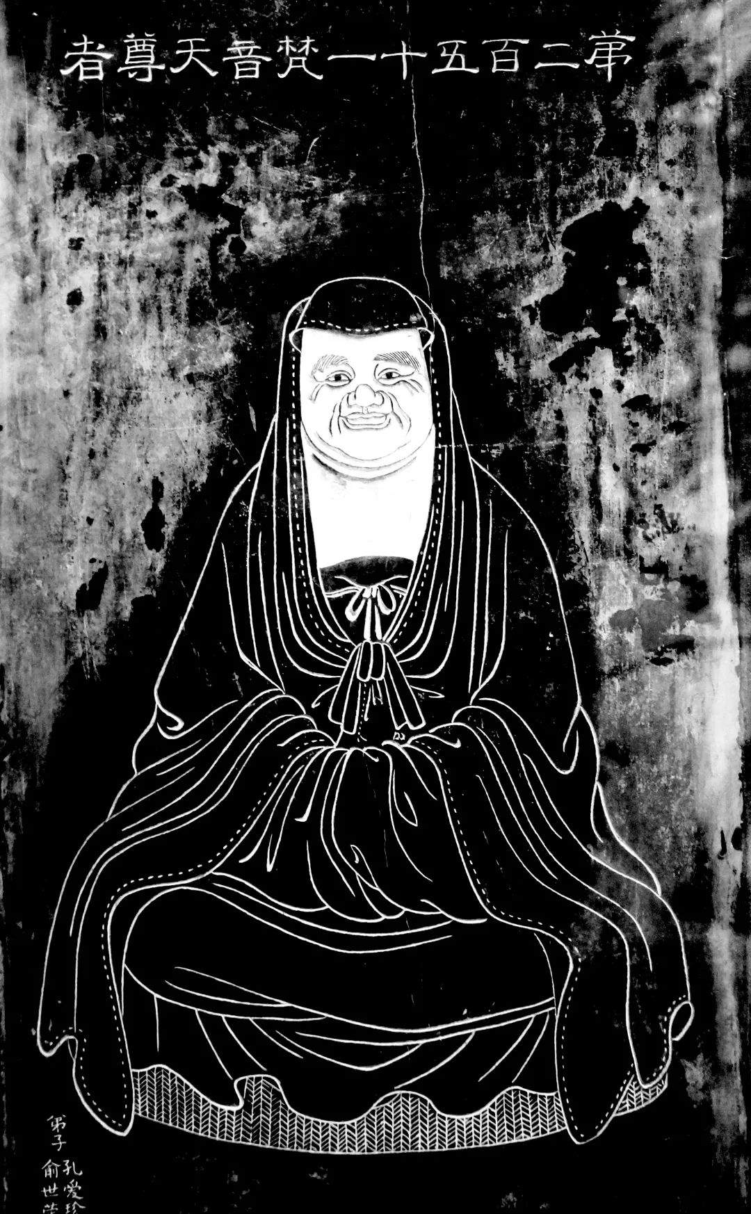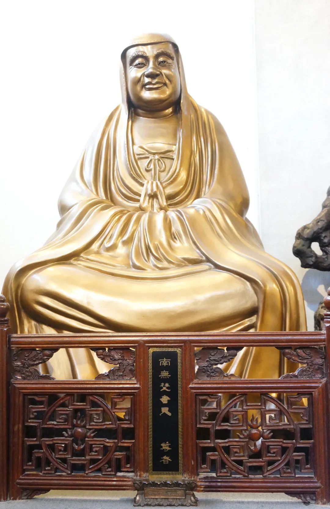尊者法相所现为结跏趺坐,面露笑容,慈眉善目,双手拢于袖内。