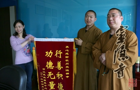 浙江民政康复中心张院长特意准备了锦旗,感谢灵隐寺"行善积德,功德无量"。