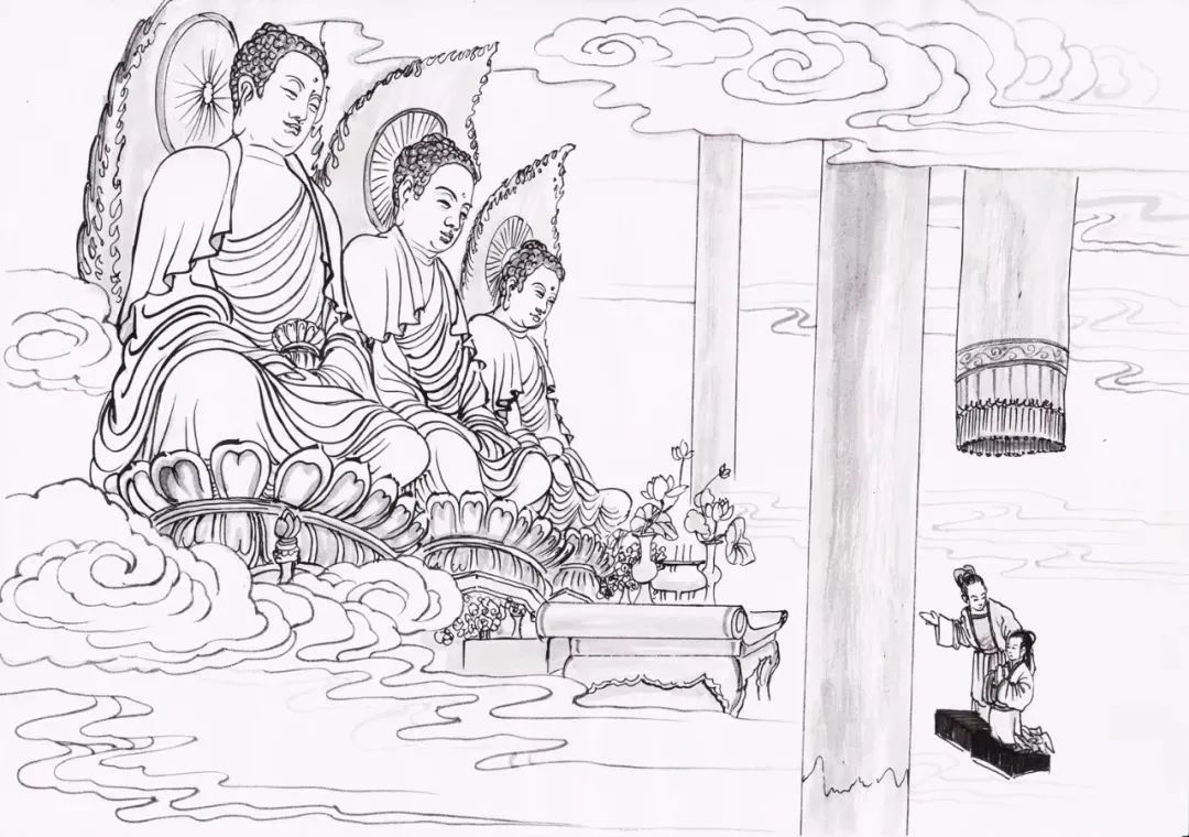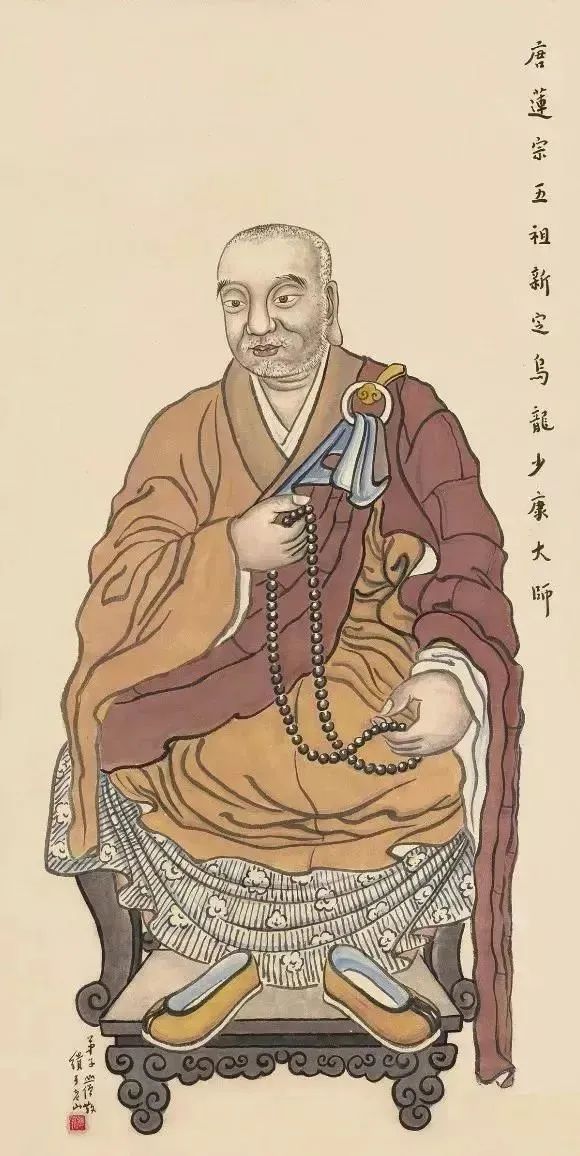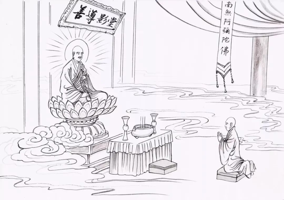 尔后,大师往诣长安光明寺善导大师的影堂,恭敬瞻礼,大陈荐献。乞求发愿欲见善导大师,诚心所感,导祖真像化现佛身,指示少康大师曰:“汝依吾教,广化有情,他日功成,必生安养。”