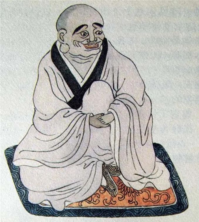 尊者法相所现为正面而坐,面露笑容,睁目露齿,双手抱膝。
