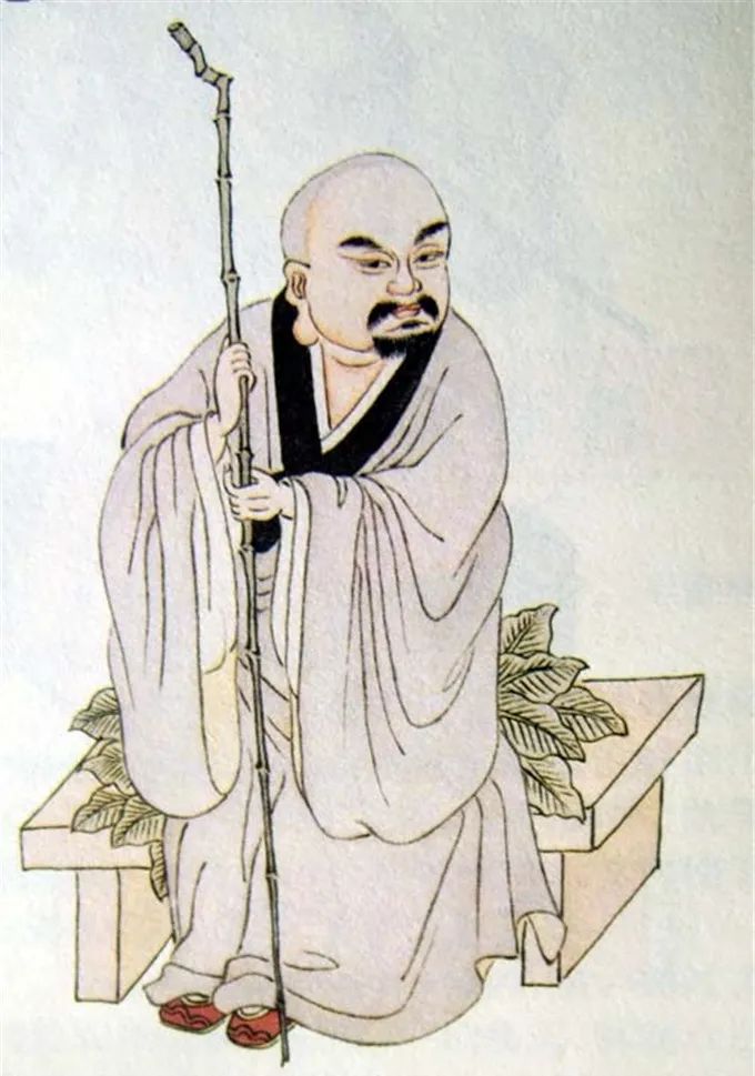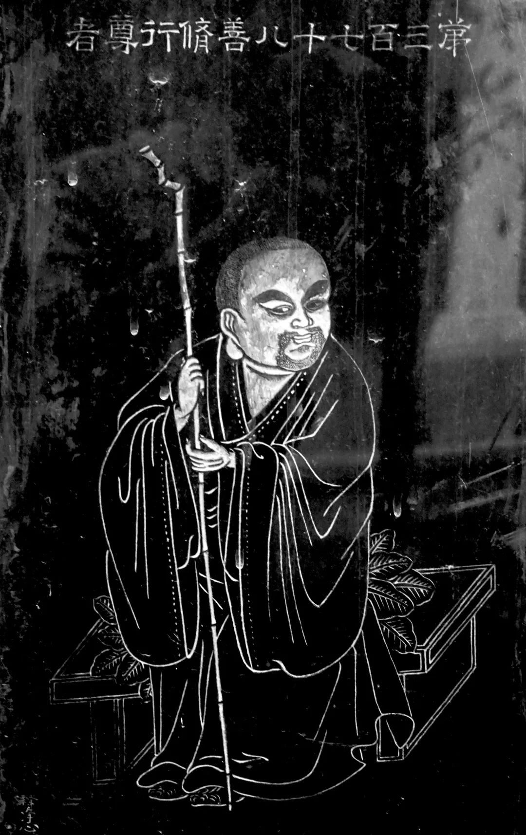 尊者法相所现为正面而坐,面如满月,浓须大耳,双手持竹杖。