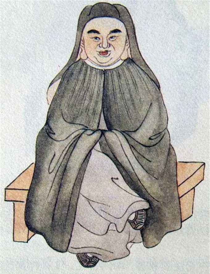 尊者法相所现为正面而坐,双耳垂肩,面露笑容,身披斗篷,右脚翘于左腿上。
