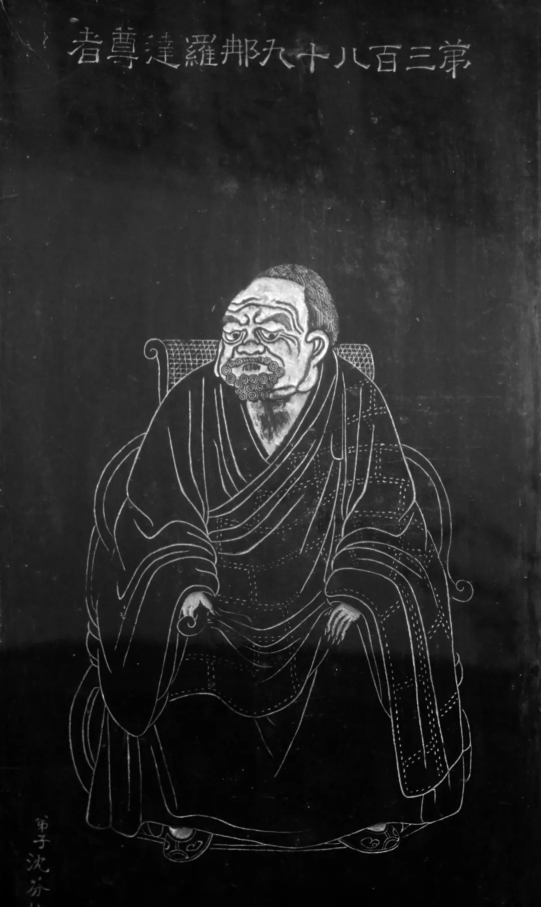 尊者法相所现为正面而坐,身穿袈裟,浓须大耳,双手置于膝上,右手持法器。