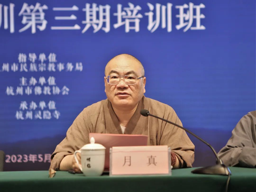 月真法师要求,市属各寺院一是要按照全省宗教领域安全生产隐患大排查大整治行动部署和市民宗局宗教领域消防安全“七个一”活动的要求,全面排查整治安全风险隐患,扎实推进佛教领域“除险保安”工作。二是要深入贯彻落实“推动绿色发展,促进人与自然和谐共生”的二十大精神,积极响应市民宗局部署开展的“同心同行·共筑亚运”提质创优专项行动,展现杭州佛教形象。三是要对标对表省委统战部、省民宗委《关于支持宗教界全面从严治教的意见》的文件要求,立足荷担如来家业、推动佛教健康传承,不断加强自身建设,推进全面从严治教,向社会展示杭州佛教清净庄严的良好形象。月真法师对参训学员提出三点期望:一是要学习政策,树立法治思维。要认真学习国家政策法律法规和“五史”、“三爱”主题教育,坚定立场,爱国爱教,扎实提升政治素养。二是要加强闻思,提升佛学素养。要珍惜此次培训机会,认真学习,积极提升佛教专业水平,以学促进,以学促修,坚定正信、转变学风、纯正道风。三是要持戒学戒,提升个人修为。要不断提升个人修为,以戒为师,以律严身,修身养德,以身作则,秉持俭朴理念,追求纯正信仰,自觉抵制不良风气,树立清净庄严的良好形象。市民宗局党组成员、二级巡视周晓明指出,宗教教职人员轮训是落实我省宗教“十百千万”人才培育工程的重要举措,自去年7月份,市、区两级佛教协会先后举办了11期培训班,参训人数近600余人,在全省佛教界发挥了“省会城市”的示范带头作用,得到了省民宗委和省佛协的高度肯定。周晓明在讲话中要求:一是要通过学习树立“大局观”和“法治观”。要在学习中纯正信仰、获得启发、汲取力量,自觉以社会主义核心价值观为引领,自觉用中华优秀传统文化为浸润。宗教法律法规日趋完善,宗教事务管理更加规范,这就要求宗教教职人员要牢固树立国大于教、国法大于教规、教民首先是公民的普遍认知。二是要通过学习守好“政治观”和“教风观”。坚持我国宗教中国化方向的第一个要求就是“政治上自觉认同”,具体来说是“五个认同”。教风是宗教的生命线,教风建设的好坏,事关宗教的健康发展,事关宗教的社会形象,事关宗教积极作用的有效发挥。此次培训班是为了深入学习党的二十大精神,贯彻落实全国全省全市宗教工作会议总体工作部署开展的。按照省佛协教职人员轮训要求,根据市佛协五年轮训工作计划,开设了宗教政策法规、“五史”教育专题、佛教史、认识菩提心、天台止观、唯识学、书法等丰富多样的课程和消防安全知识技能培训、消防知识问答、消防演练等活动,并邀请到省佛协会长、市佛协名誉会长光泉法师为大家开展示范讲经活动。此次培训班在课程设置上继续优化,培训形式上力求贴合杭州佛教实际,还加入杭州亚运主题,共同平安护航杭州亚运会。