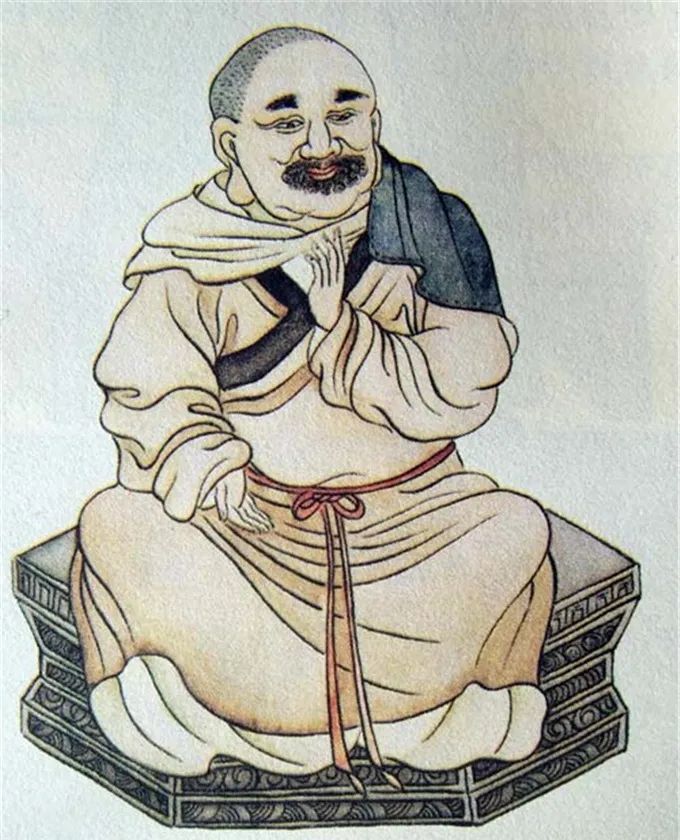 尊者法相所现为正面而坐,面含笑容,浓须大耳,双手结印。