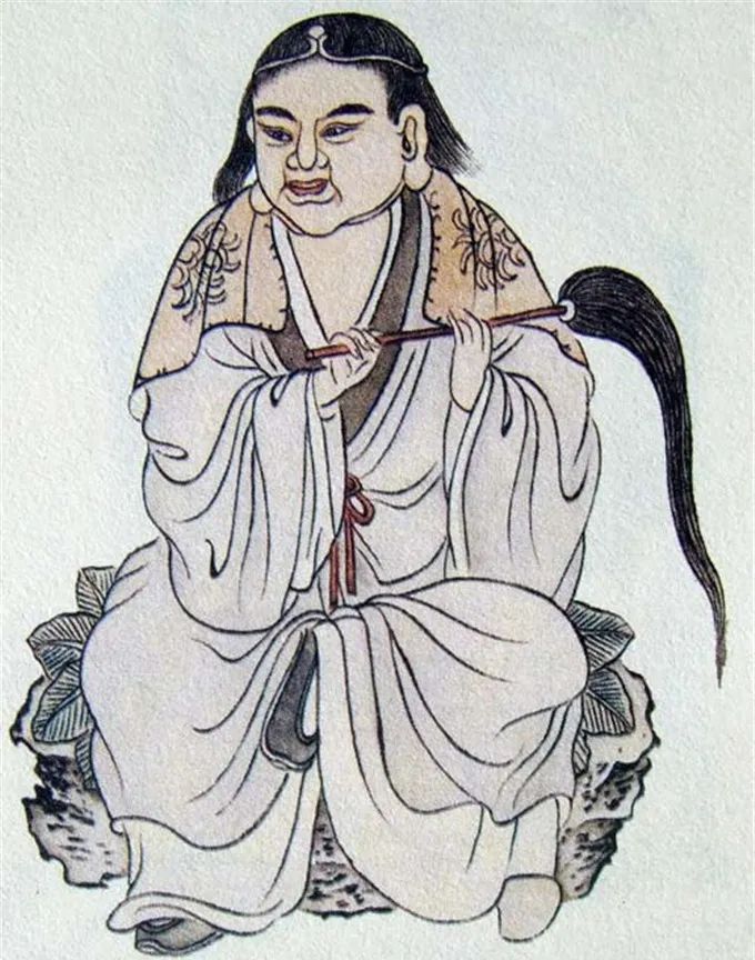 尊者法相所现为正面而坐,面容饱满,左腿弯曲,双手持拂子。