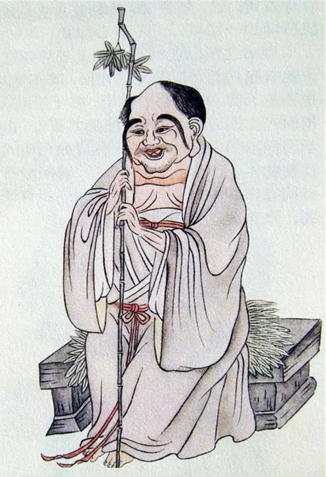 尊者法相所现为正面而坐,长眉大耳,面露笑容,双手持竹杖。