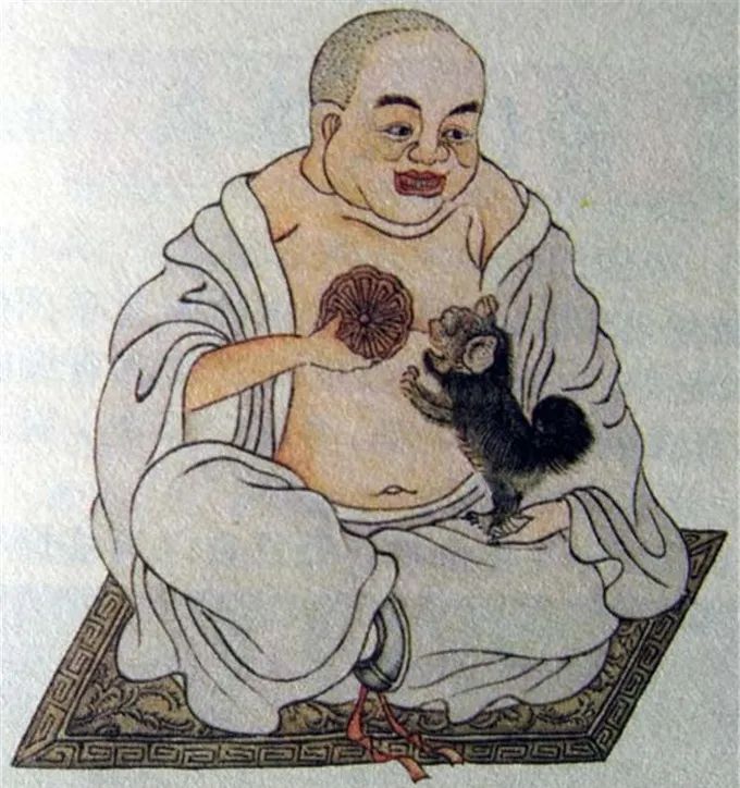 尊者法相所现为正面而坐,浓眉大耳,面露笑容,右手持法器,左手抱有灵兽。