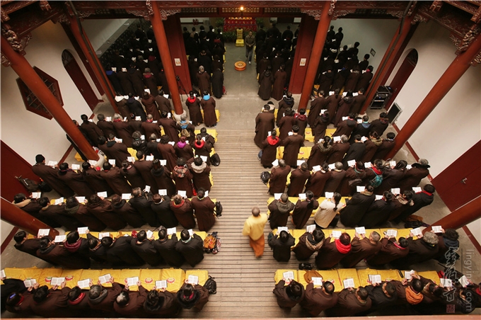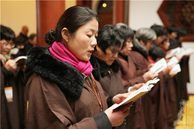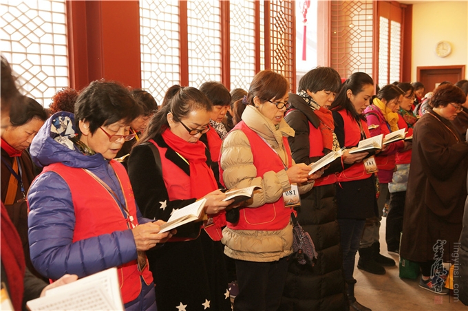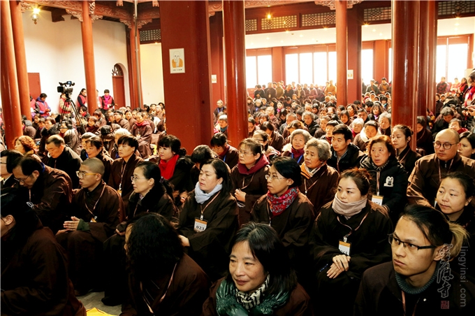 2017年2月2日,农历正月初六,新春伊始,灵隐寺老斋堂诵经声洪亮整齐,灵隐寺居士新春贺年活动在朗朗诵经声中拉开序幕,三百多名居士从四面八方赶来,共贺新春。灵隐寺方丈光泉法师向大众致以节日的问候,并开示《药师琉璃光如来本愿功德经》大意,以及药师如来因地所发的十二大愿,接引大众,饶益有情。