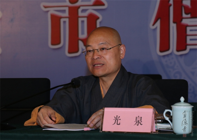 光泉法师为大众宣讲了十九大精神学习分享,并结合杭州佛教界建设与展望,向与会大众提出了学习会议精神、践行出家僧伽弘法利生的使命的要求。