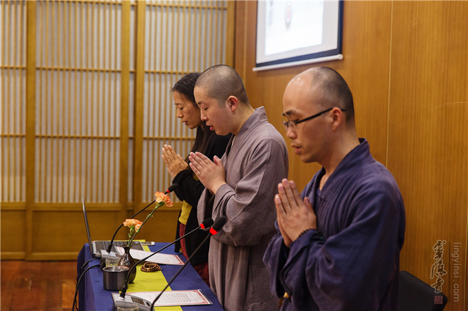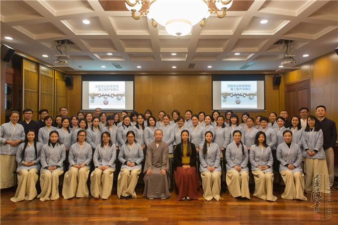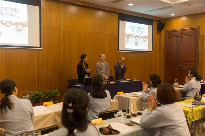 灵隐寺云林茶修第三期在镇法法师、门宏法师和陈绿芳老师的带领下拉开了序幕。首先由镇法法师和门宏法师给学员们作了佛门礼仪讲解,门宏法师通过慧可求达摩祖师安心的公案给学员们开示:"在寺院学茶先要安住自己的心,茶修是一种重要的静心方法、慧悟通途,于行茶处寻找皈依处——入席、静定、止念、行茶,用慈悲之心执壶,注以包容之水,在茶叶中结感恩之善缘,于禅心处显真如"。