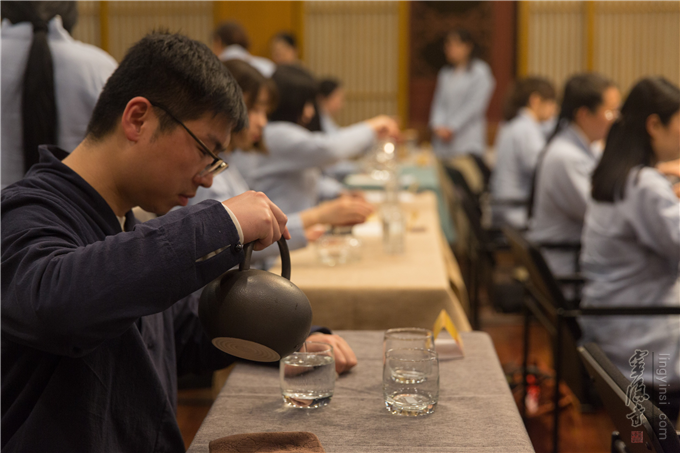 "观自在菩萨,行深般若波罗密多时,照见五蕴皆空……"悠扬的诵经声打破了千年古刹灵隐寺夜晚的宁静,只见华严阁 三楼灯火通明,来自各地四十多位茶修班的学员在这里相遇。