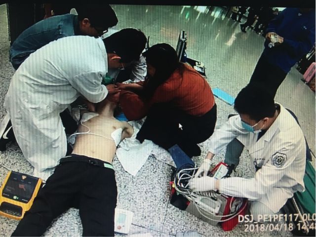 经过大家合力的CPR复苏和两次的AED除颤,五六分钟后病人就恢复了心跳,紧接着病人的呼吸也恢复了。随后急救医生将病人送到117医院机场路院区继续进一步抢救。