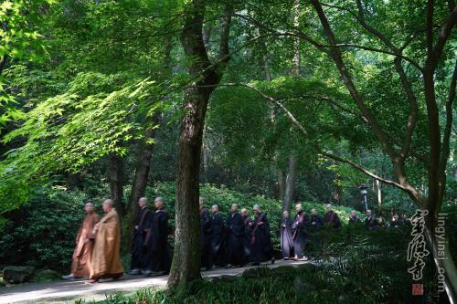 2018年4月25日,戊戌春灵隐寺护国兴圣二部僧三坛大戒法会如期举行,在结界前夕,众引礼法师带领戒子至杭州虎跑寺旧址举行礼祖法会,祭扫弘一法师舍利塔,缅怀南山律宗第十一代中兴祖师弘一法师。