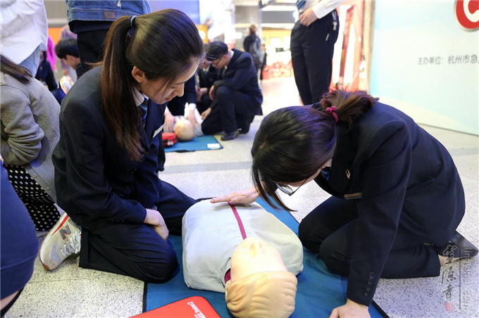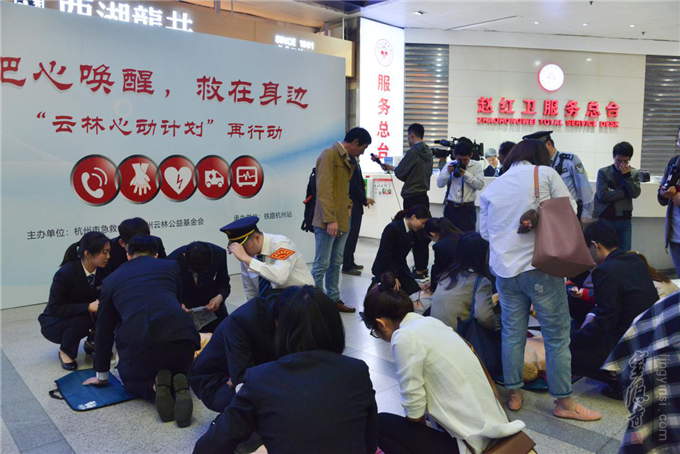 同时联合杭州市急救中心在城站火车站二楼候车大厅现场进行AED/CPR实操培训,向大众展示AED的使用方法。