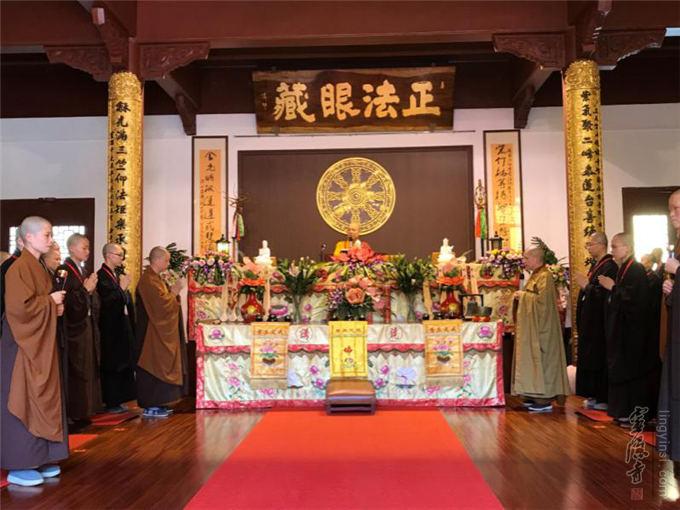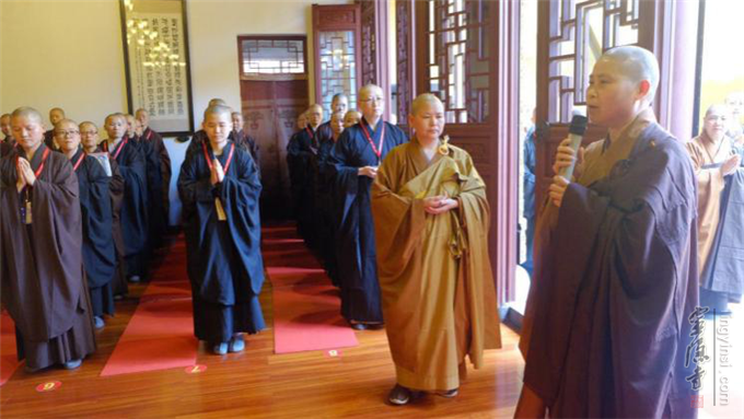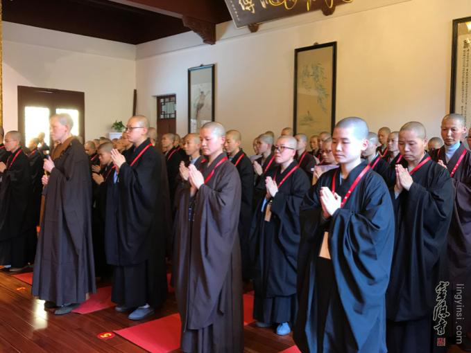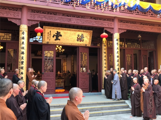 2018年4月27日,戊戌春灵隐寺暨法镜寺护国兴圣二部僧三坛大戒法会进入第三天。灵隐寺方丈光泉大和尚莅临杭州法镜寺三坛大戒法会(女众部)坛场。在法镜寺住持智圆法师、监院智仪法师的陪同下,为200余位戒子开示。光泉大和尚寄语大家以戒为师,不忘初心。