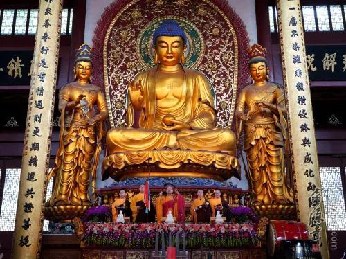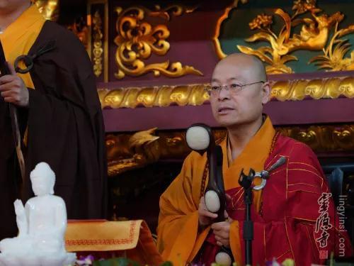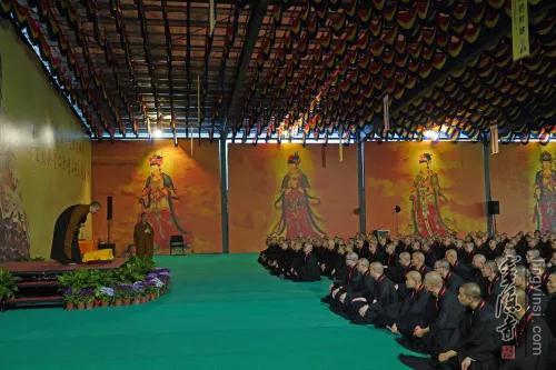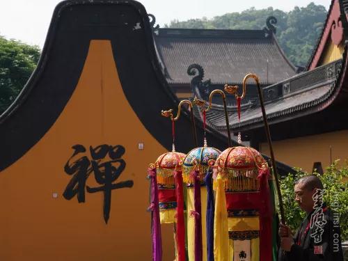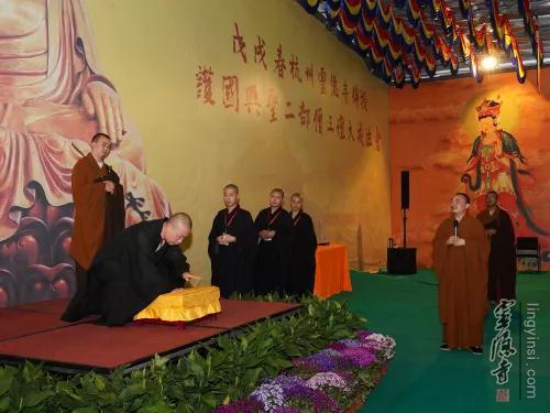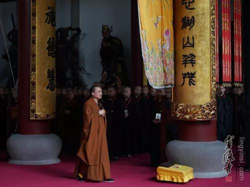 上堂斋法会时,众戒子由引礼师带领齐聚药师殿,得戒大和尚灵隐寺方丈光泉大和尚手持如意,于药师殿登坛主法,三秉拂尘,振杖说法: