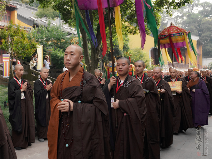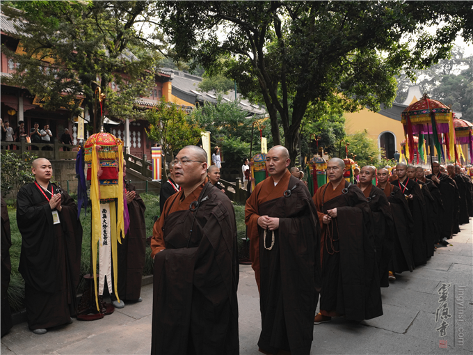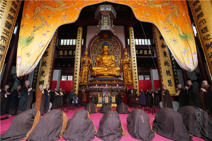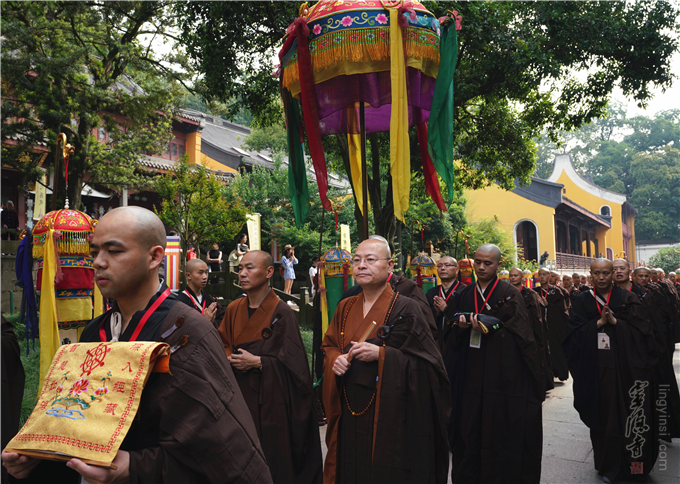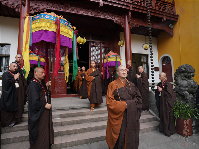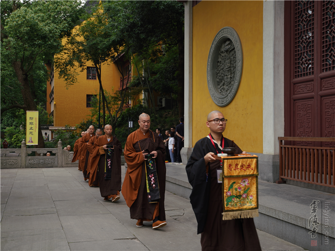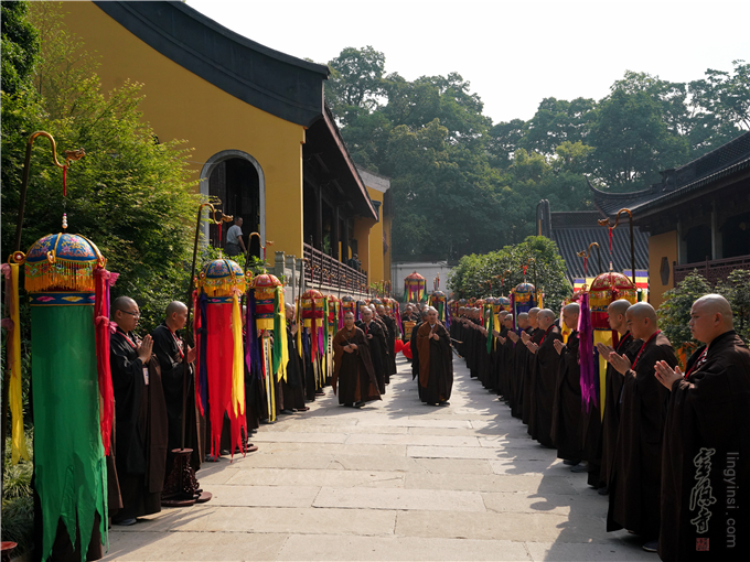 5月12日,灵隐戒场,法幢高悬,钟鼓齐鸣,佛号声声,梵呗悠扬。一大早,戒子们整肃身心、衣钵齐备,于药师殿前整齐排班,恭迎"三师七证"。