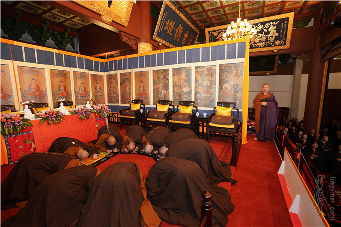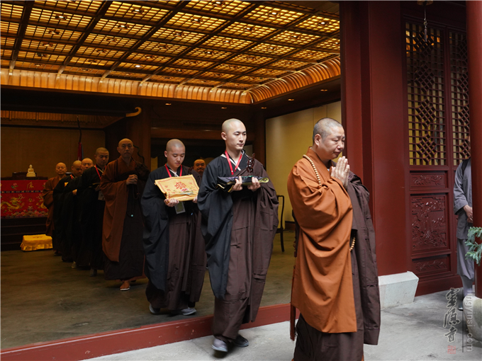 随后,戒子们口诵"南无本师释迦牟尼佛"圣号,以庄严仪仗迎请"三师七证"至戒坛。"三师七证"依次登入戒坛,展和合具,普礼三拜,以表"大众和合无违诤,是乃可得同受戒"之佛制。