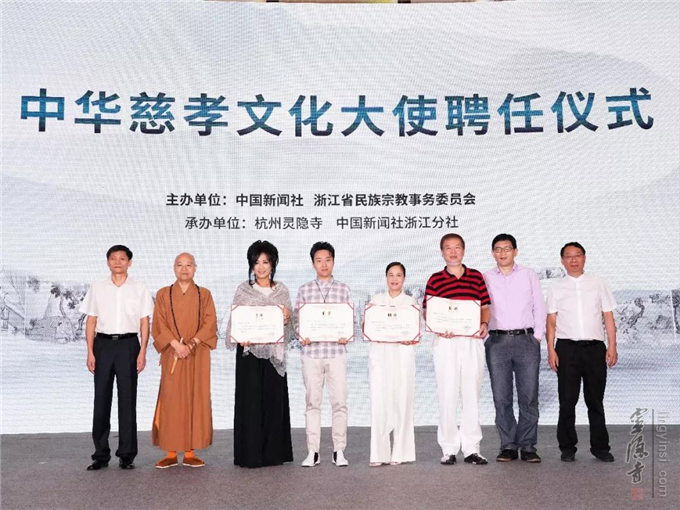 杭州市人大常委会副主任张建庭,中华文化学院党组成员、教务长李道湘,中国佛教协会副秘书长、杭州灵隐寺方丈光泉法师,中国新闻社党委常委、副总编辑王旻分别为四位中华慈孝文化大使颁发聘书。