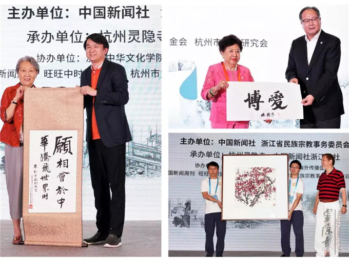 中新社原副社长、大鸾翔宇慈善基金会创始会长、周恩来侄女周秉德女士,孙中山和平教育基金会主席孙穗芳女士和著名书画家何水法大师向大会赠送了书画作品。