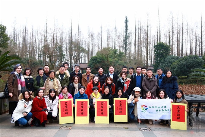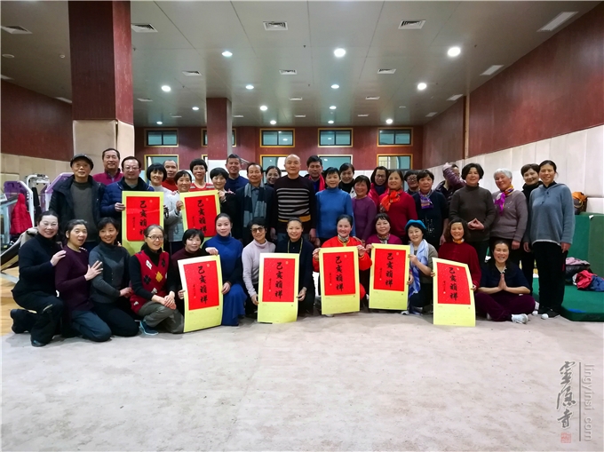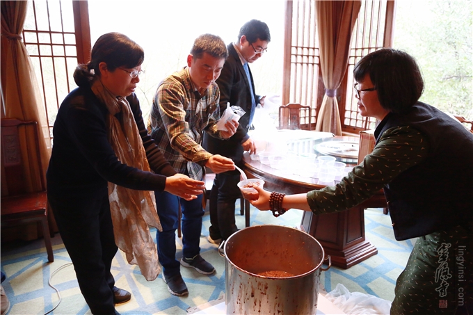 当天下午,辅导员们共同体验"易筋经"运动方法,品尝灵隐腊八粥,同持己亥新年挂历合影。