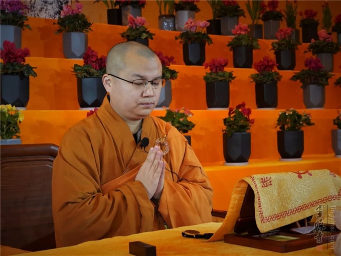 上午8点30分,四众弟子迎请讲经法师登坛说法。受杭州灵隐寺方丈光泉大和尚委托,本空法师以《最胜妙法供实为报佛恩》为题,为大众开示。