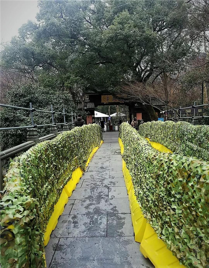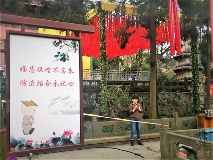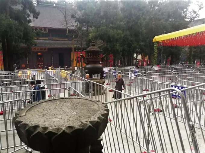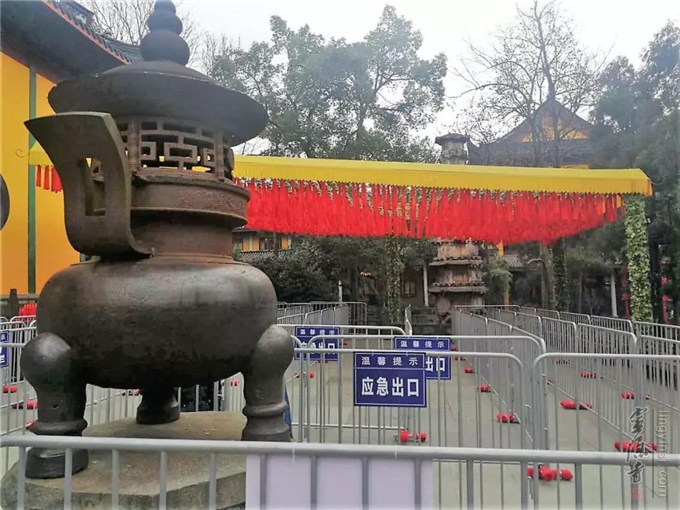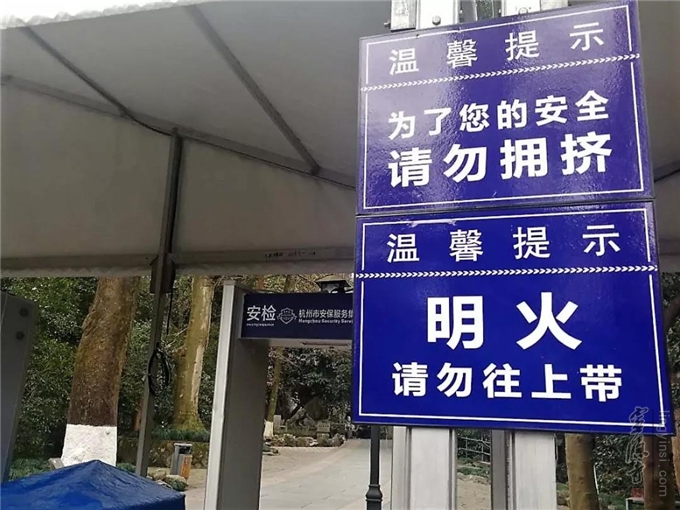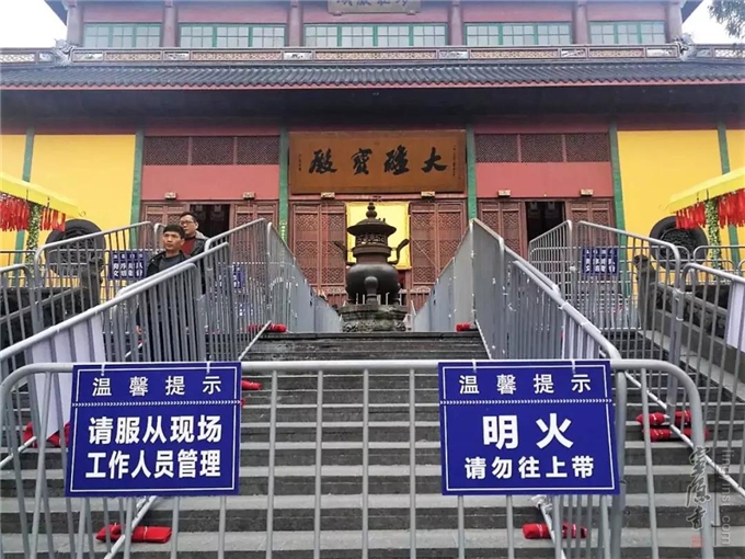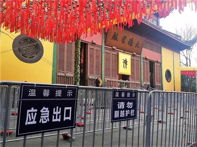 在灵隐寺大雄宝殿前,已经安置了一排排回形通道,用于限制人流,确保礼佛秩序。在许多地方,都可以看到安全警示的标识。可以感受到,灵隐寺已经做了大量的准备工作,应对即将到来的香客潮。