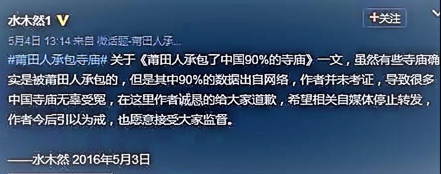 《莆田人承包了中国90%的寺庙》一文作者早在2016年5月便删除文章并向佛协致歉,承认"90%的数据出自网络,作者并未考证,导致很多中国寺庙无辜受冤",并呼吁"相关自媒体应该立即停止转发"。