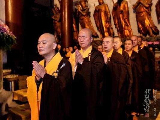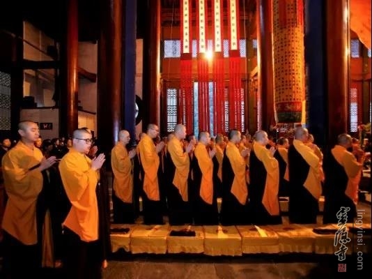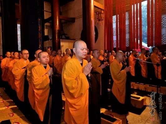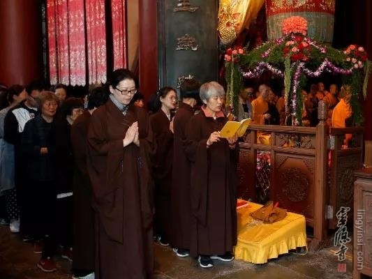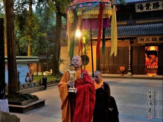 清晨四点四十八分,杭州灵隐寺僧众搭衣持具上殿,按东西序位次分班而立。闻磬声向上顶礼三拜后,庄严仪仗出班恭迎佛像。同声唱念"南无本师释迦牟尼佛"。