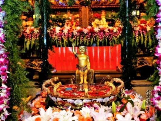 两千五百多年前,释迦牟尼佛降诞于世间。佛陀出生之时,天地大放光明,花雨缤纷,香风四散,九龙时水,为之沐浴净身;诸天奏乐为之欢欣庆跃。佛陀踏上大地,足下自然生出莲花,东南西北前行七步,一手指天一手指地,口自唱言:"天上天下,唯我独尊!三界皆苦,吾当安之!"