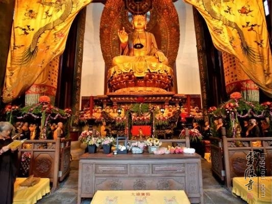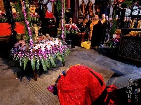 大殿钟鼓齐鸣,主法和尚将佛像安座金盆,然后上香、展具、顶礼三拜。