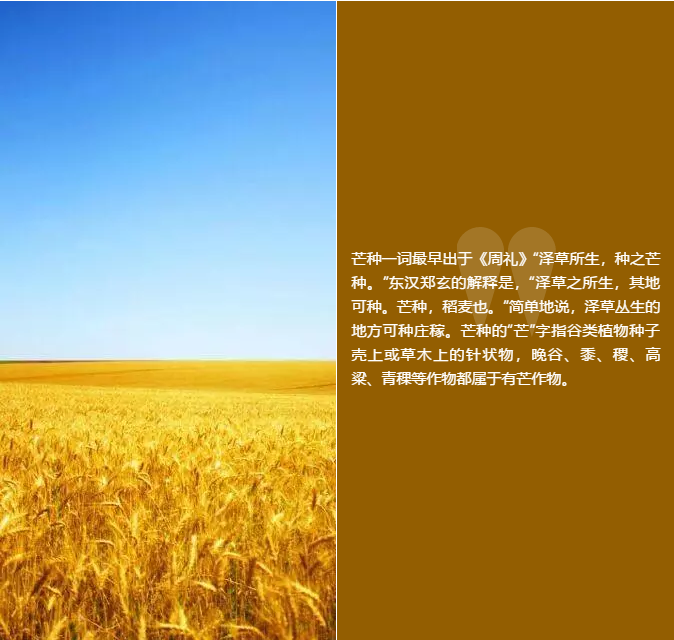 俗话说:芒种芒种, 连收带种。芒种适逢我国南北农业夏收、夏种、夏管的"三夏"大忙时节,民众因此也称其为"忙种"。朴实的古人取它的谐音"忙种",更直接地提醒人们季候已到了农忙时节,农民该开始一年里最忙碌最辛苦的田间劳作了。