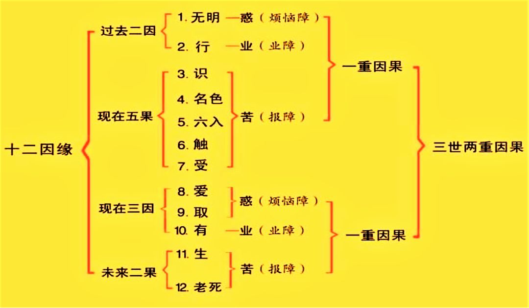 因缘者,因是亲因,如种子;缘是助缘,如水肥。单因不生,孤缘不长,因缘和合,自然结果。"无明、行、识、名色、六入、触、受、爱、取、有、生、老死"十二支,展转感果为因,互相藉由为缘,故称十二因缘。