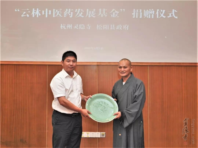2019年9月7日上午,杭州灵隐寺在华严阁举行"云林中医药发展基金"捐赠仪式,向松阳县中医药发展基金会捐赠500万发展基金,用于促进松阳县中医药事业发展。