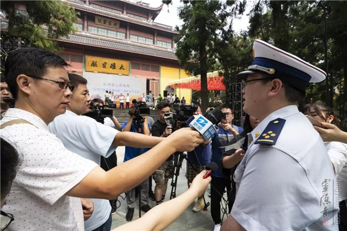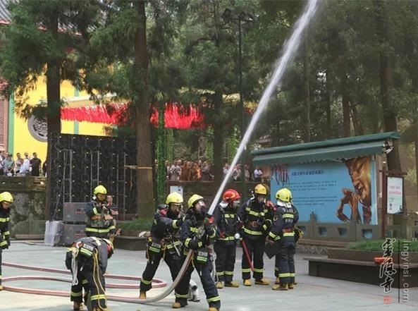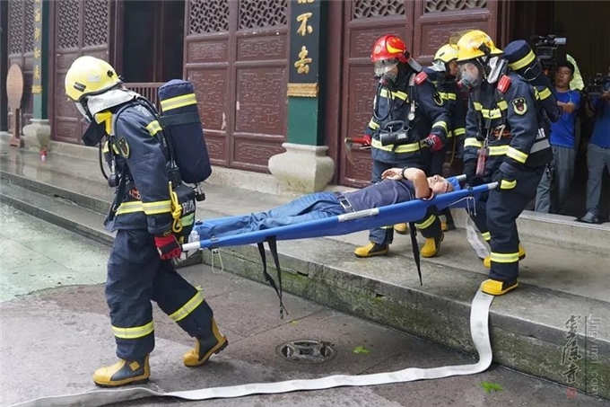 在9月9日举行的杭州市宗教活动场所"防风险·保平安·迎大庆"消防安全活动现场,模拟了杭州灵隐寺天王殿内部电气线路着火、有人员被困的消防演练。