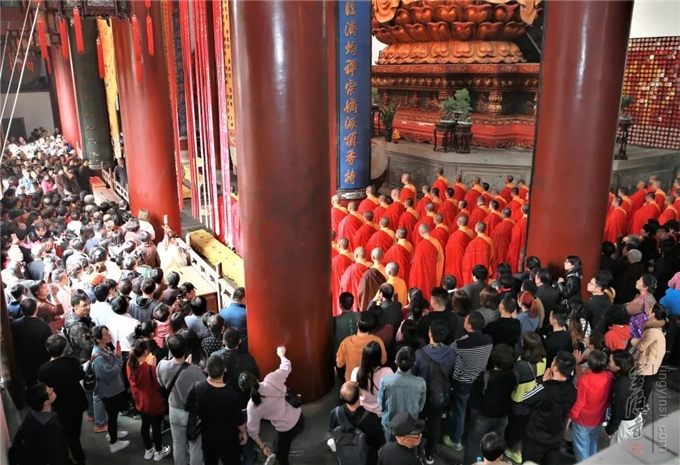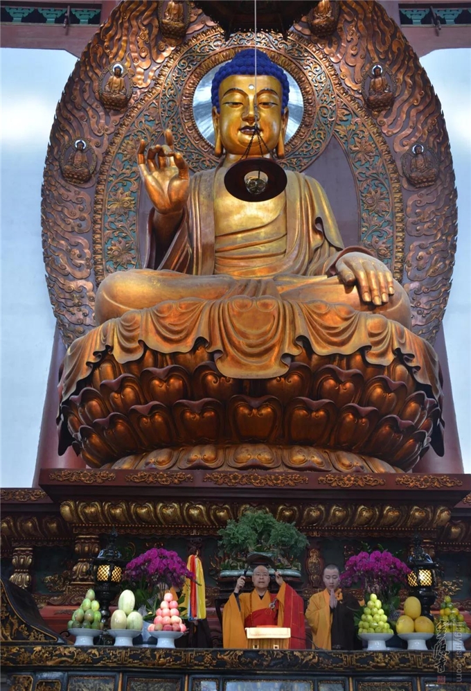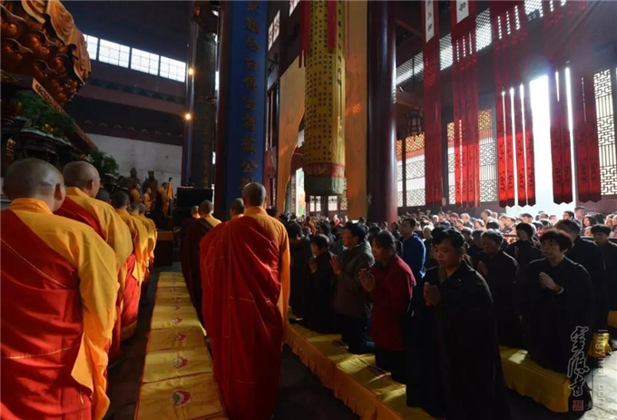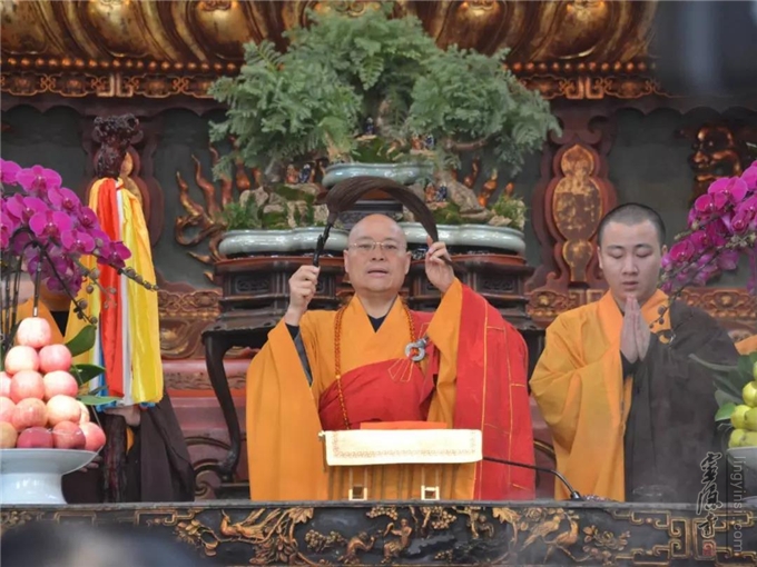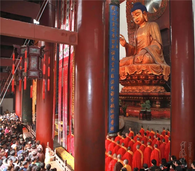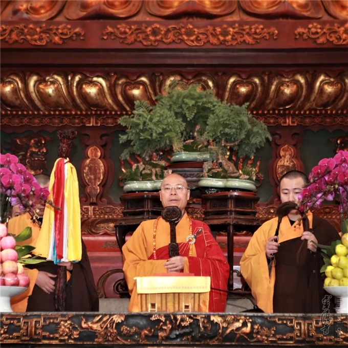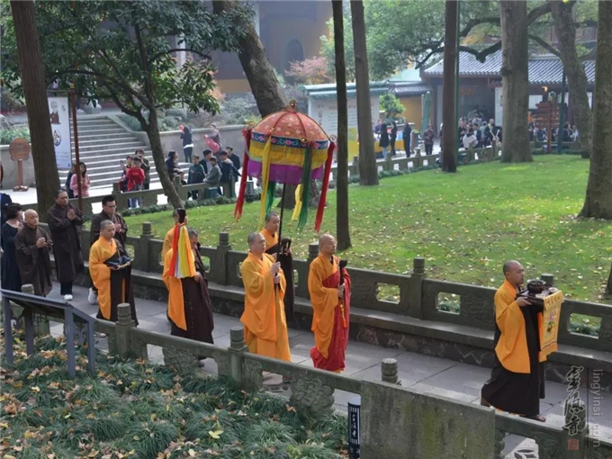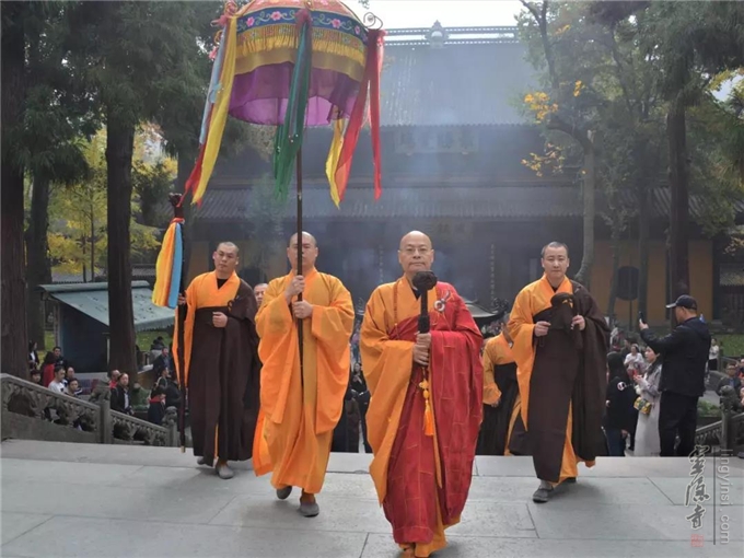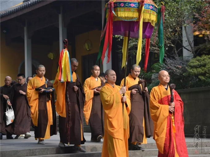 在僧众及功德主的迎请下,杭州灵隐寺方丈光泉大和尚从客堂到大雄宝殿上堂说法。
