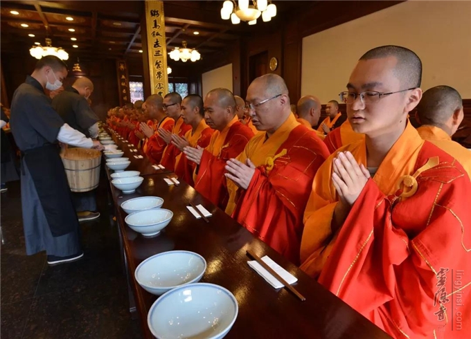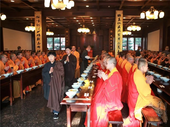 僧众有序前往灵隐寺斋堂,应供食斋。上堂大斋是寺院非常隆重的佛事之一。所谓上堂,即恭请和尚在堂上为大众说法,并供斋一堂。请法师上堂说法,是佛教供养中最为隆重的供僧植福方式之一。