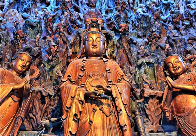 观音菩萨,随类逐形,寻声救苦,就如青霄圆月,影含众水,小至沧海一粟,大至千江湖海,都能看到水中清月。与此一月,普现众水,随人随地,各见其貌,无所分别,这便是观音菩萨的普门示现