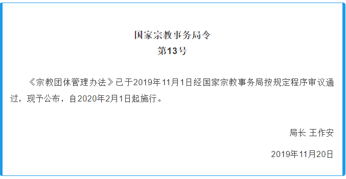 2019年11月20日,国家宗教事务局令第13号公布了《宗教团体管理办法》,自2020年2月1日起实施。《宗教团体管理办法》的公布实施,对于深入贯彻落实新修订《宗教事务条例》,规范宗教团体管理,加强宗教团体自身建设,进一步发挥宗教团体桥梁、纽带作用,具有重要意义。