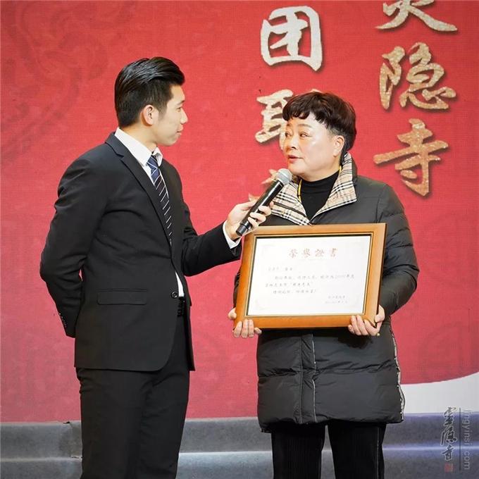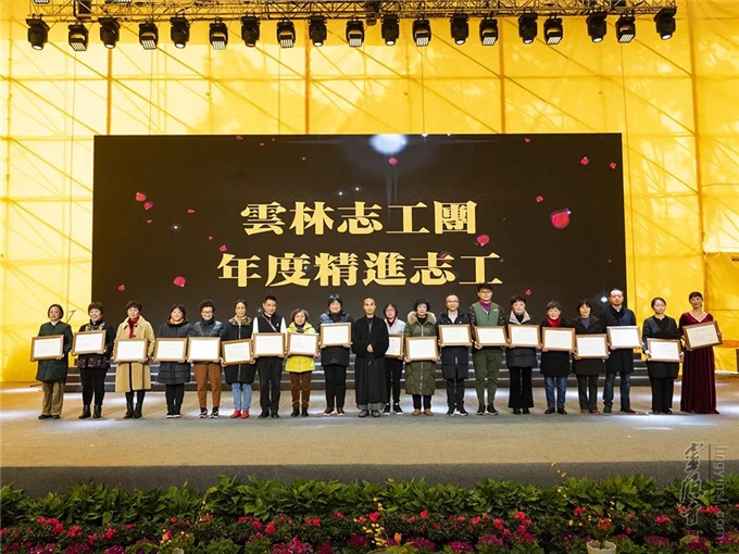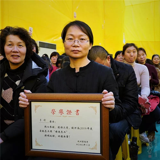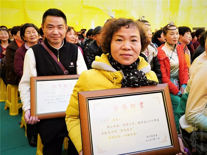 2019年,在志工团队中涌现了许多甘于奉献、助人为乐、精进修学的优秀志工。他们以实际行动践行知恩感恩,以身作则,做志工的志工,共同增进。在联谊会上,十九位"年度精进志工"受到表彰。杭州灵隐寺监院心如法师给"年度精进志工"颁发荣誉证书。