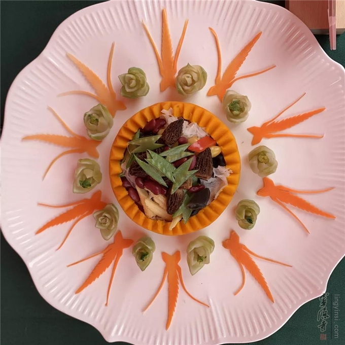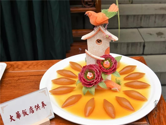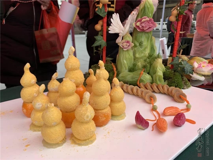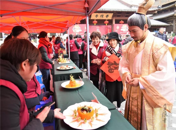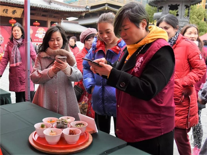 素食展示区精致的素食菜品也吸引了众多目光,这些都是由杭州老字号餐饮饭店专门供奉"灶司菩萨"的精美素菜,令人叹为观止。