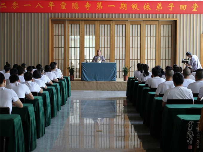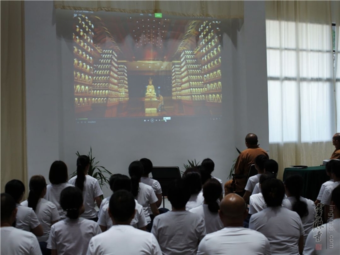诸法师利用晚上共修时间,组织学员们观摩微电影《灵隐寺法广法师》。法广法师是青海西宁人,家有80岁的老母。
